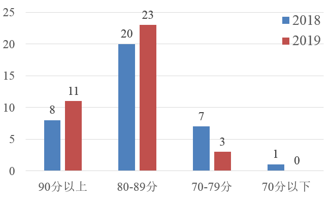 (一)政府采購信息公開整體水平明顯提升。各地區高度重視政府采購信息發布平臺建設,普遍加強了對采購項目信息發布的監管力度,其中,北京、福建、廣東、天津等地區政府采購信息公開工作一直穩定在較高水平。從得分分布看(圖1),高分段地區增多、低分段地區減少,90分以上地區由2018年的8個增加到2019年的11個,80分以下地區由2018年的8個減少到2019年的3個,首次實現沒有低于70分的地區。